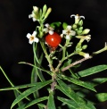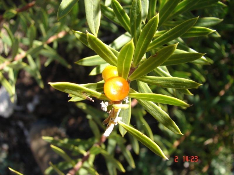 Flora Iberica: Arbusto hasta de 2 m de altura, muy ramificado. Tallos densamente foliados en gran parte de su longitud, cubiertos de pelos cortos (0,1-0,25 mm) y adpresos, con la corteza pardo-rojiza o –según van envejeciendo los tallos– grisácea. Hojas (10)20-30(50) x (2,5)3-7 mm, esparcidas, de lineares a linear-oblanceoladas, acuminadas, atenuadas en la base, persistentes, coriáceas, glabras, punteadas por el envés. Inflorescencias terminales, paniculadas, multifloras (10-60 flores), constituidas por un racimo apical ebracteado y varios axilares –a veces con alguna bráctea– que no sobresalen netamente de las hojas axilantes hasta la fructificación; racimos todos inicialmente corimbiformes, hasta de 4 cm de longitud en la fructificación. Flores 5-6,5 mm de longitud, subsésiles o con pedicelos hasta de 2 mm. Hipanto 3-4 mm, poco persistente, con pelos adpresos y densos –hasta de 0,2 mm– por fuera. Sépalos 1,5-2,5 mm, ovados, obtusos, pubérulos por fuera, de color crema. Fruto 7-8 x 6-7 mm, carnoso, globoso, pubérulo, de un rojo brillante. Semilla 4-5 x 2-3 mm, ovoidea, atenuada apicalmente. n = 9; 2n = 18.